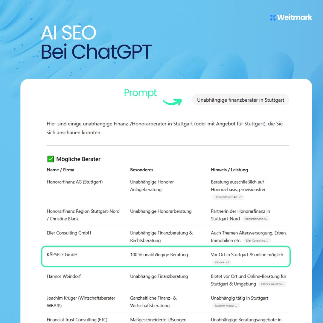 Wir machen Ihre Marke sichtbar in ChatGPT, Perplexity & Co. Mit KI-Optimierung, SEO und Geo-Fokus stellen wir sicher, dass Finanzberater und Dienstleister auch in Antworten von LLMs präsent sind