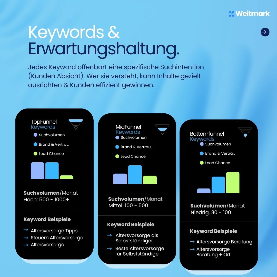 Dazu bauen wir Ihre Seiten so auf, dass Suchintention getroffen wird (z. B. Honorarberatung, Vermögensberatung, Versicherungsberatung, unabhängige Finanzberatung).