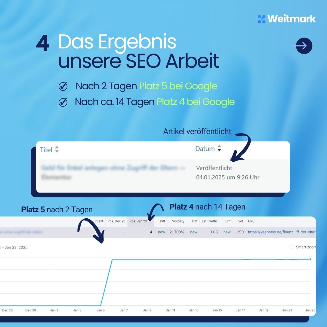 Das hängt von vielen Aspekten ab. Zum Beispiel der Konkurrenz, die Autorität Ihrer Website, ist ihre Website neu oder schon etabliert und natürlich Qualität der Inhalte. Es kann manchmal schnell gehen und manchmal etwas länger dauern. Aber man kann grob sagen, dass 6-8 Monate Sie die ersten Ergebnisse erkennen können.