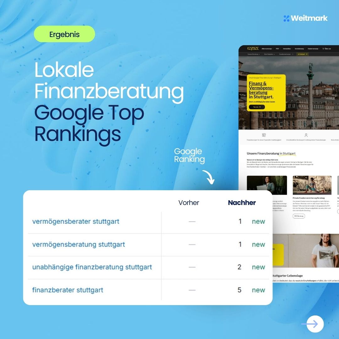 - Ihre Website auf den ersten Plätzen für „Finanzberater in [Ihrer Stadt]“.