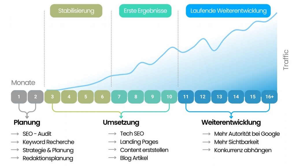 Langfristige Platzierungen in den Suchmaschinen, sodass ihre Website auch ohne ständige Werbeausgaben kontinuierlich sichtbar bleibt